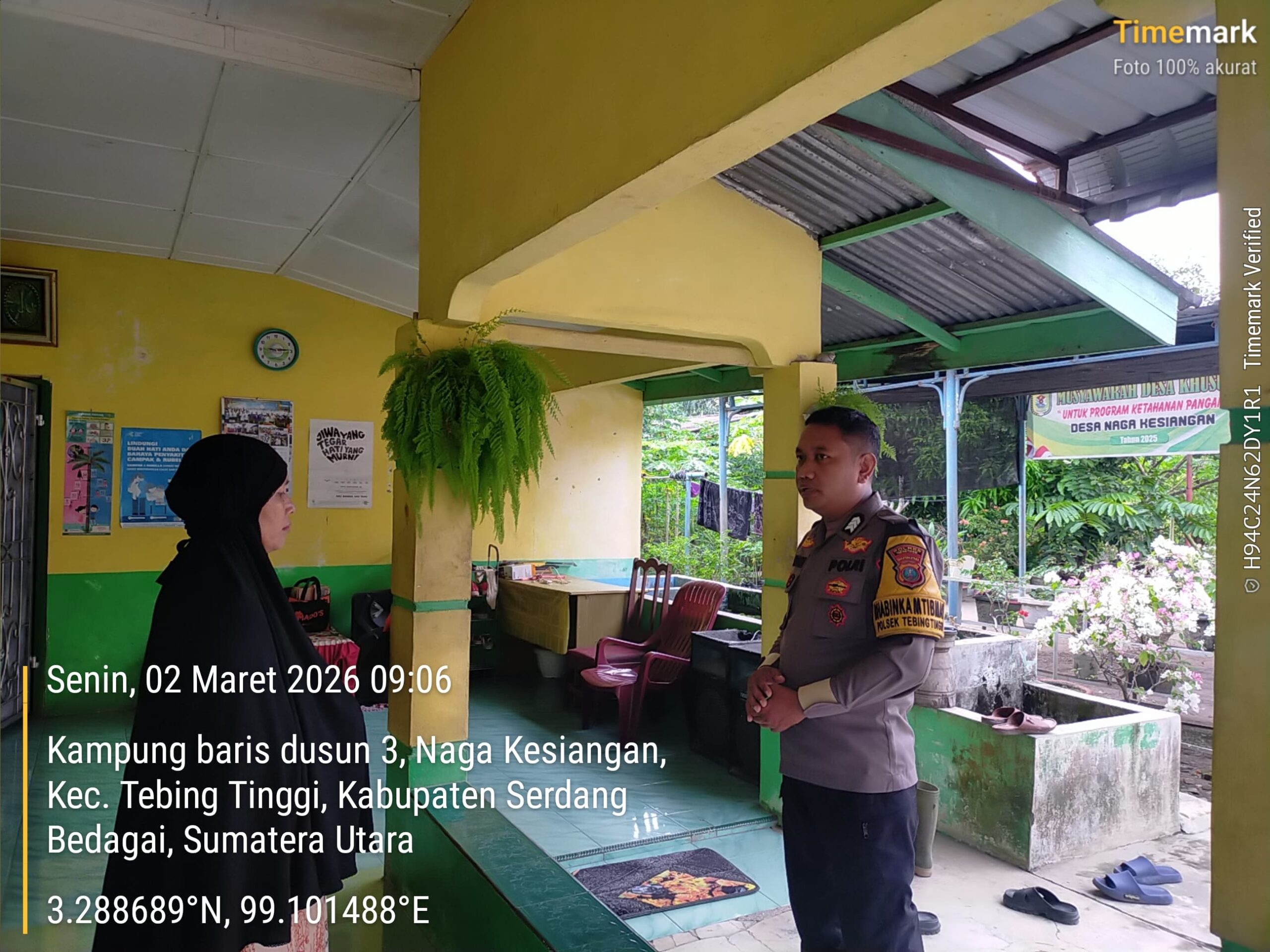 Bhabinkamtibmas Polsek Tebing tinggi Resor Tebing tinggi Brigadir Supandi melaksanakan sambang ke rumah warga dan mengajak saling menghargai sesama umat beragama khususnya saat memasuki bulan puasa. Kegiatan ini berlangsung di Dusun 3 Desa Naga Kesiangan Kecamatan Tebing tinggi Kabupaten Serdang Bedagai, Senin (2/3/2026).