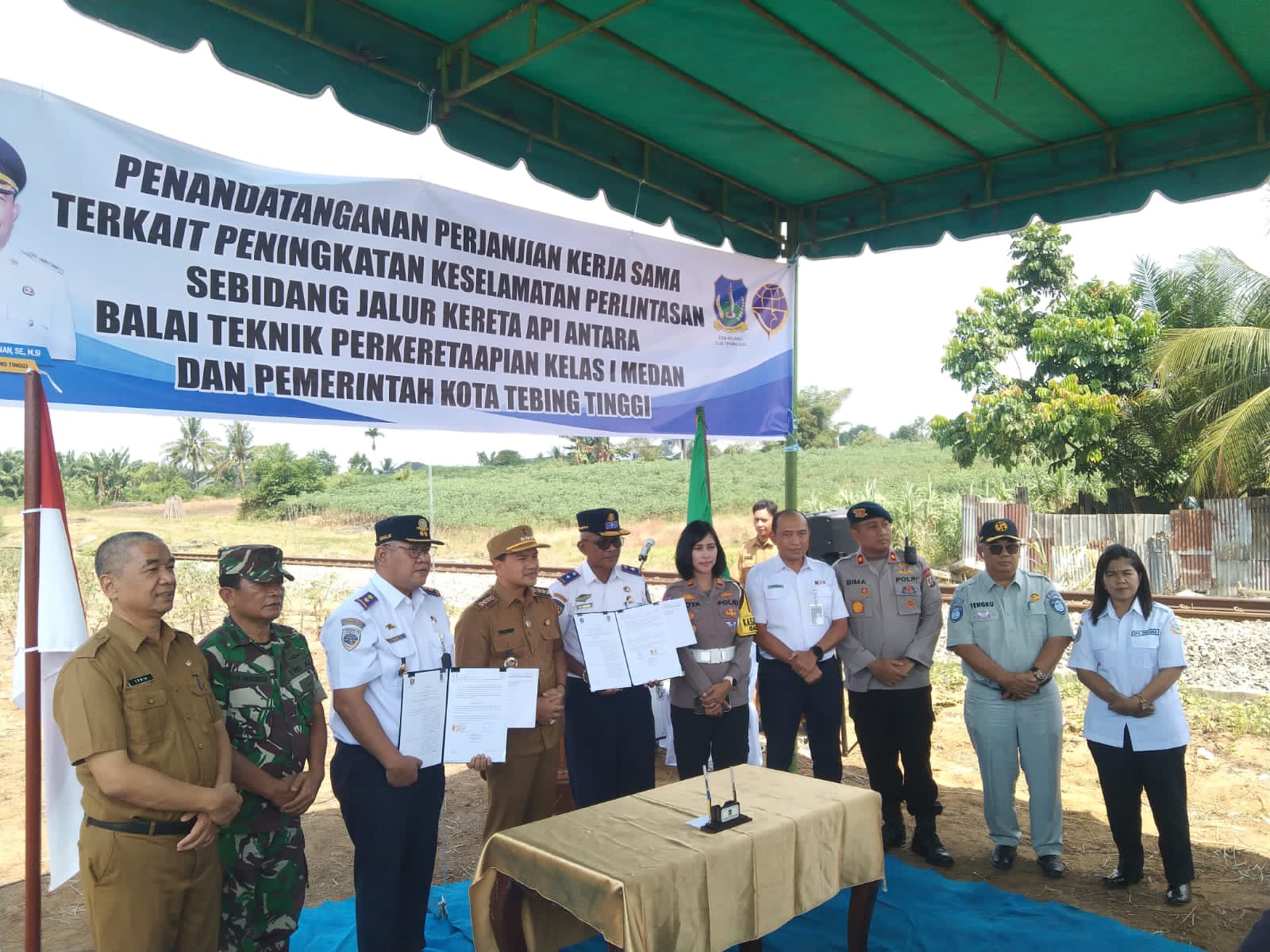 Sebagai komitmen peningkatan keselamatan perlintasan sebidang jalur kereta api, Kapolres Tebing tinggi diwakili Kasat Lantas Polres Tebing tinggi AKP Lidya, S.Trk, SIK, MH menghadiri penandatanganan Memorandum of Understanding (MoU) atau nota kesepakatan antara Pemko Tebing tinggi dengan Balai Teknik Perkeretaapian Indonesia Tingkat 1 Medan bertempat di Jalan Abdul Hamid Kecamatan Padang Hilir Kota Tebing tinggi, Selasa (10/2/2026).